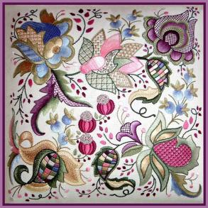 25cm x 25cmJaoobean Footstool is a design which was taught at the Koala Conventions annual Embroidery & Textile Event. It measures 25cm x 25cm and covers a multitude of crewel stitches and techniques. It is ideal for intermediate embroiderers.