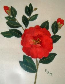 25cm x 16cm (9.84" x 6.29")The design for the Camellia was created using live plant material as a reference. Bets designed and stitched this beautiful Camellia to resemble a flower in her garden. The embroidery techniques used is called Barbola which is related to stumpwork, however does not use wires.