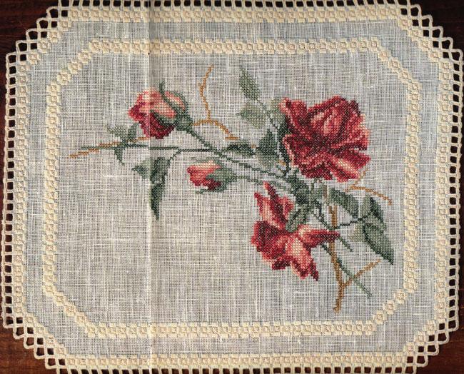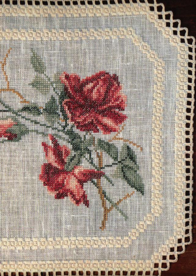 The Climbing Rose has a stitch count of 178 wide x 146 high (with hardanger) 126 wide x 95 high for roses only. Climbing Rose was worked in cross stitch using one strand of cotton over 2 threads of 30 count linen.