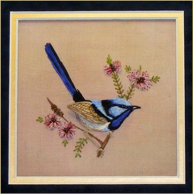 This cute Fairy Wren is stitched on hand dyed silk organza over trigger cloth, giving a wonderful translucent background. The little bird and flowers are stitched in silk threads and the wren has a wired stumpwork wing. The design measures 10cm x 9cm. The Stitches used include French knot, stem stitch, satin stitch, close buttonhole stitch, back stitch