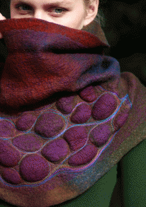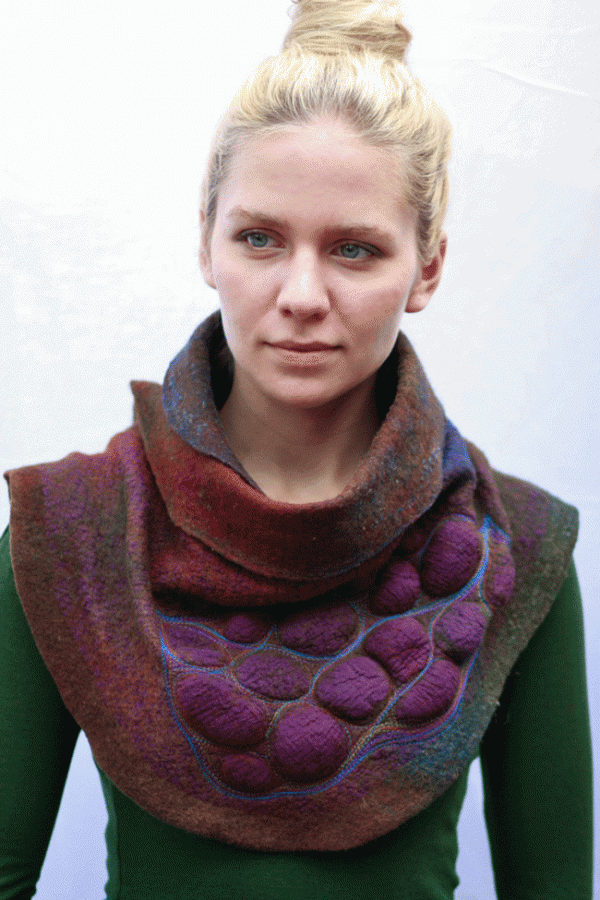 Join Katia for an exclusive workshop in Australia with Koala Conventions. Russian born and living in the USA, Katia is the designer and owner of Feuer und Wasser. In this project, you will create a large cowl/capelet/wrap OR seamless vest (depending on your choice or skill level). You will begin by creating a pattern for the garment, based on individual measurements. Next, you will work on the idea for the details in the design and colors, and will create sketches thereof. The final stage will be the nuno-felting of the garments, the use of decorative techniques, freeform embroidery, and the creation of smooth color transitions, as well as all finishing touches. Students will create exciting effects with the use of a sander during this workshop. Please choose your colour options when booking in.