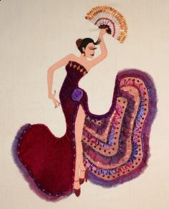 A3Continuing the series of Catherine's embellised Ladies, she has now added to her collection an exotic Latin dancer. She has a hand dyed silk velvet gown, complete with frilly petticoat adorned with variegated silk ribbon and crink silk frills, interspersed with sequins and beads. Her elaborate fan is embroidered with metallic threads, beads and leaf shaped sequins.