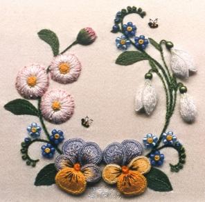 This small stumpwork garland was inspired by spring garden flowers. Worked on a background of ivory satin, the design features the heartsease (Viola tricolor) with detached petals, raised snowdrops (Galanthus) with wrapped stems and beaded calyx, padded and embroidered daisies (Bellisperennis), small beaded forget-me-nots (Myosotis) and tiny bees. The finished piece may be framed or mounted into a large gilt pincushion. The design measures 10cm x 10cm.