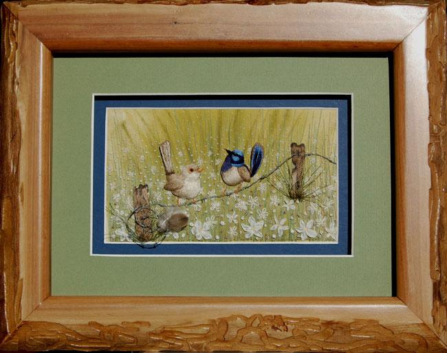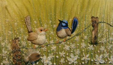 Two gorgeous dimensional Fairy Wrens perched upon a hand made barbed wire fence. The background silk fabric will be hand painted for you.