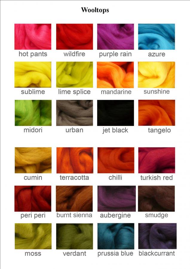 The beautifully soft wooltops come in 32 colours and are produced from Australian Merino Sheep. They are ideal for wet felting and are professionally dyed, ensuring a high level of colour fastness and colour repeatability. These wooltops are not chemically treated.
