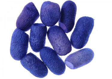 Silk cocoons as supplied by us have cut ends where the moth has been removed. They are hand-dyed by Stef Francis in a wide range of colours, and are fantastic for embellishment, 3 dimensional work, necklaces, etc