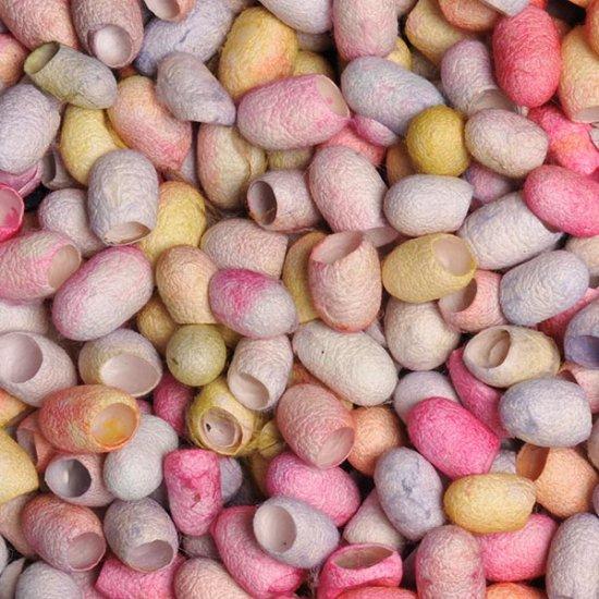 These Stef Francis silk cocoon collections are 25 g in weight and dyed in 9 multicolour mixes. Quantity in pack (average) : 76 cocoons and there may be some cocoon end caps and fibre in these packs also.