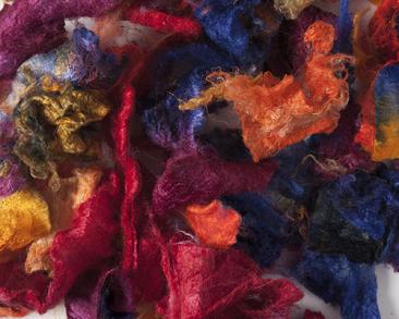 This product is great for use with an embellishing machine, or for needle felting as the pieces are all of different interesting shapes shapes and thicknesses. The flats and curls are hand-dyed in a range of named multi-colours, which give an indication of possible application, but of course, its up to you !