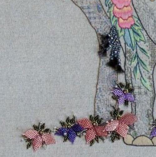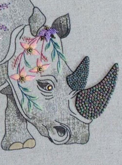 This huge and interesting animal, a throwback to the time of the dinosaurs, is critically endangered because of poaching. Whilst normally seen with tick birds perching on their backs, Roger has been prettied up with Jacobean Flowers instead. This project measures 430 x 315 mm and you should not be frightened by the plethora of stitches that create the texture of the animals hide and the tree, trunk and leaf umbrella. It’s easy once you start.
