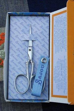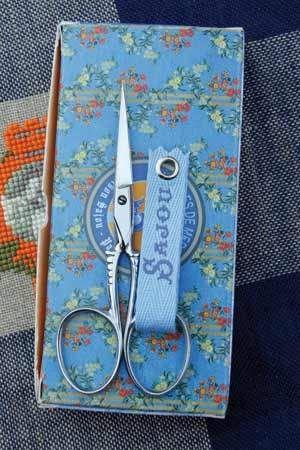 Sajou scissors are presented in a Sajou box. A label on the inside cover explains the manufacturing process.