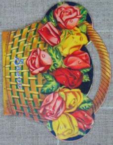 The cover represents a basket full of roses. The interior is a floral print in red and cream tones.