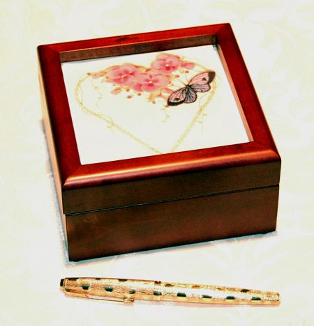 This box is completed in a Mahogany finish. It measures 5" x 5" x 1 3/4" in (12.7cm x 12.7cm x 4.44cm) and features a hinged top. This simple box has no lining or glass. The embroidery is mounted from the inside like a picture frame.