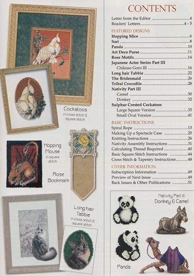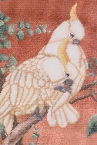 The cockatoos are worked in continental and basketweave stitch using 3 strands of Anchor Stranded Cotton ON 18 Count interlock tapestry canvas. They can also be worked in cross stitch on 18 count interlock tapestry canvas using 2 strands of thread.