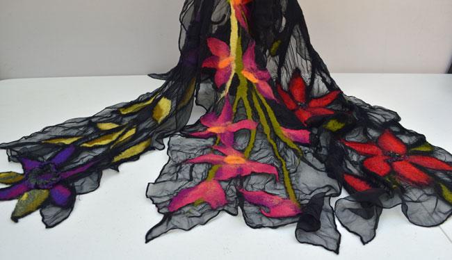 Create 2 beautiful hand felted silk scarves decorated with a variety of gorgeous patterns inspired by the colours and style of tropical flowers and flowing botanical patterns. You will also be felting 3D flowers attached to our scarves. The base fabric will be black georgette silk.