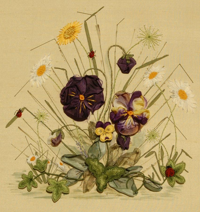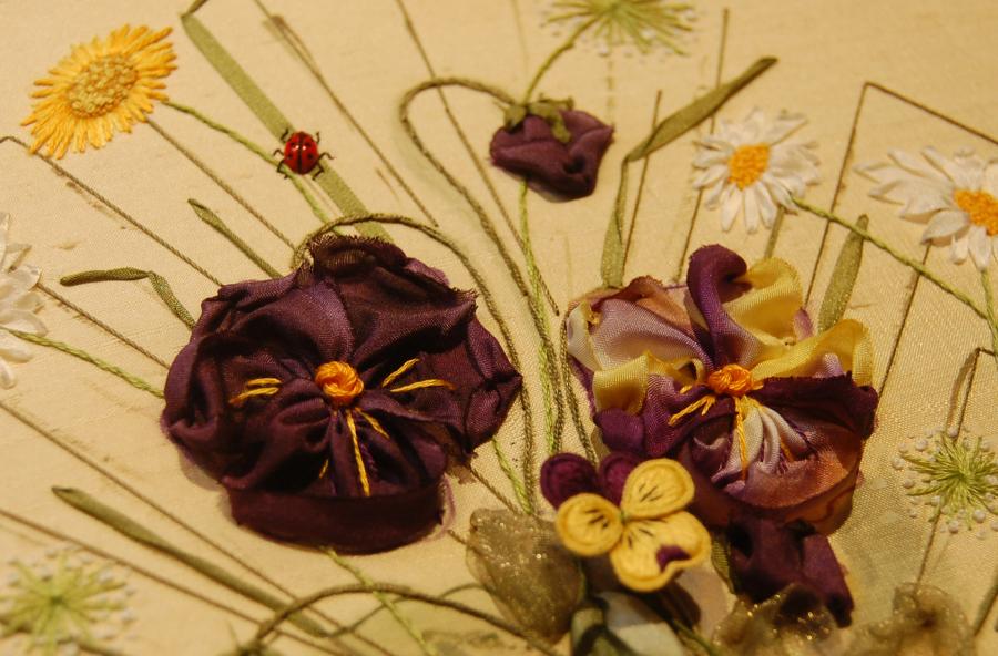 Gorgeous Hannah Silk ribbons, silk threads, Stumpwork and surface stitchery create a pretty collection of flowers and weeds, Set on a hand painted background which has been painted for you, Susan has added tiny glass lady bugs. If you have any favourite charms you would like to add to your picture, bring these along and we will add them in. The design size measures 20cm x 20cm.
