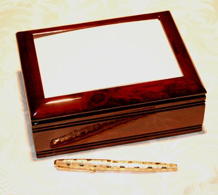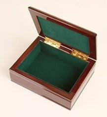The Presentation Box is finished in a high gloss Cherry Finish and is lined in a rich green velvet. The design area is 4 1/4" x 6" (10.16cm x 15.24cm) It features a hinged lid and a drop down design area. This box does not feature a glass insert over the embroidery.
