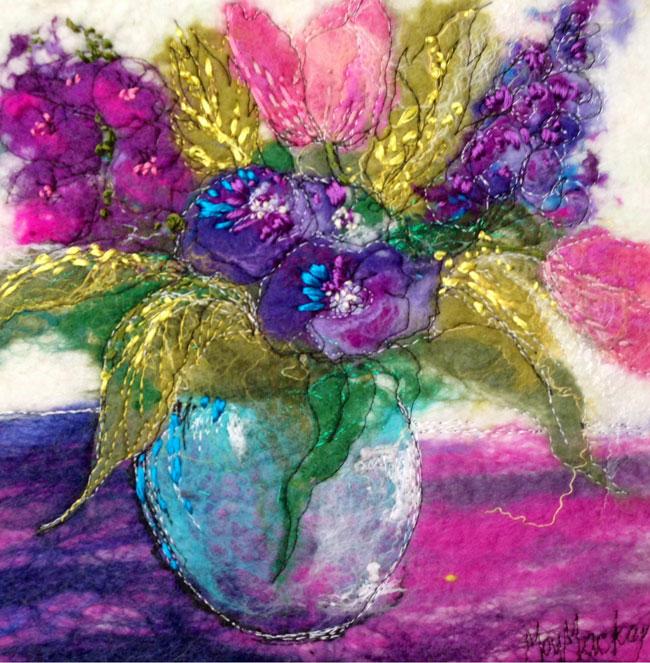 Join Moy and create a beautiful floral felted painting, during the two days, by either following one of her own paintings or from your own photos, ideas, sketches etc. Whether you wish your finished look to be contemporary, modern, real life, or impressionist you will be able to create your own unique design. You will work mainly using wet felting for the main part of the artwork , and then working into the pieces with needle felting, hand and freehand machine embroidery if required. By the end of the 2 days each person will have completed a felted painting ready for framing.