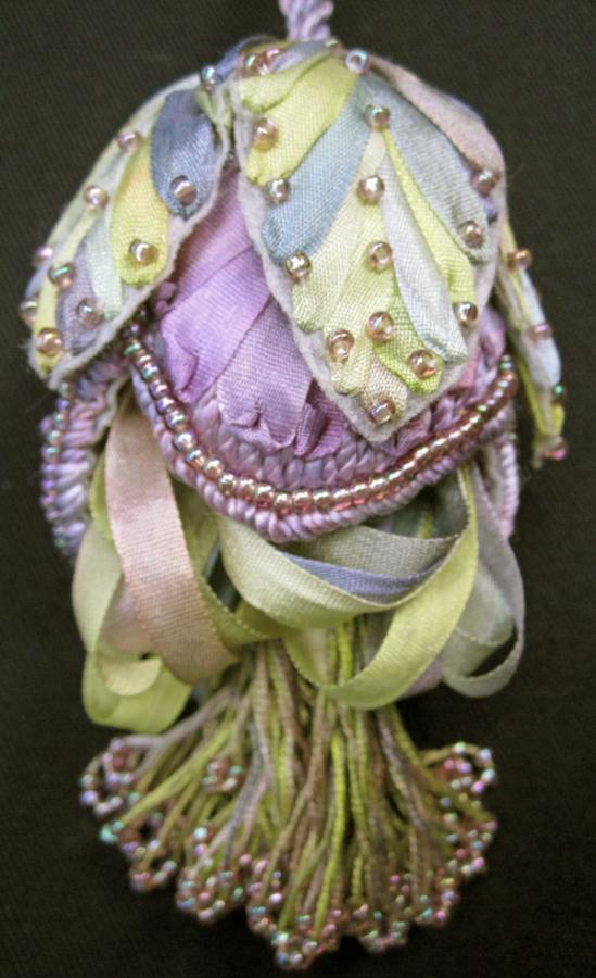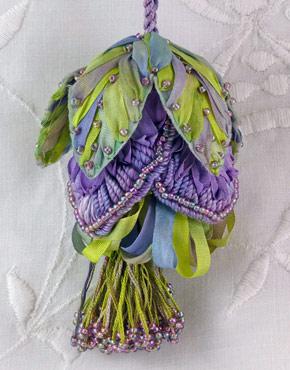 These beautiful ribbon tassels are created using silk thread and ribbons and edged with beads.