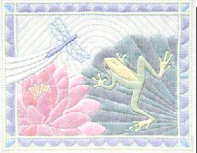 26cm x 21cmAn adventurous frog sits on the lily pad watching the beautiful Dragonfly glide over the rippling waters of the pond. Pale turquoise stitching highlights the ripples in the water and te body of the Dragonfly is satin stitched over the Trapunto shape to make him glean.