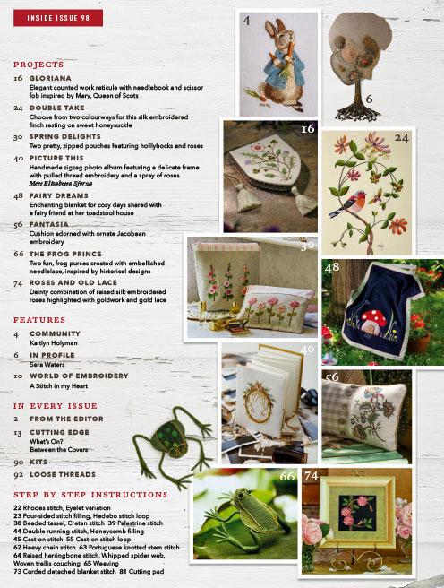 Inspirations MagazineIn this issue, we introduce Deruta Sfilato – unique counted-thread embroidery from Italy, a beautiful twist to shaded blackwork and a fun project featuring three-dimensional bead embroidery. Also find delightful projects featuring crewel and wool embroidery, plus superb stumpwork and threadpainting designs. Featured Projects 'Inspirations Issue 97' features the following projects: Gillian by Maria del Valle Olivera The use of colour with blackwork patterns combined with elegant surface embroidery is perfect for this fabulous hare design Cherry Delight by Jane Nicholas Superb stumpwork roundel with goldword and beading Marguerite by Irina Rudneva Fantastic three-dimensional, beaded white daisy with a sparkling crystal centre La Fauvette by Catherine Laurençon Gorgeous threadpainting of a European warbler amongst reeds and grasses Stitches from the Heart by Maria Elide Melani Learn a delightful Italian embroidery technique with this simple sachet Sunflowers and Daisies by Helen Eriksson A cosy woollen blanket adorned with a circlet and bouquet of sun-loving flowers Autumn Leaves by Monique Johnston A harvest of acorns, blackberries, rose hips and maple leaves embellish this doorstop Aurora by Christine Burton Timeless crewel designs on a handy, zipped pouch