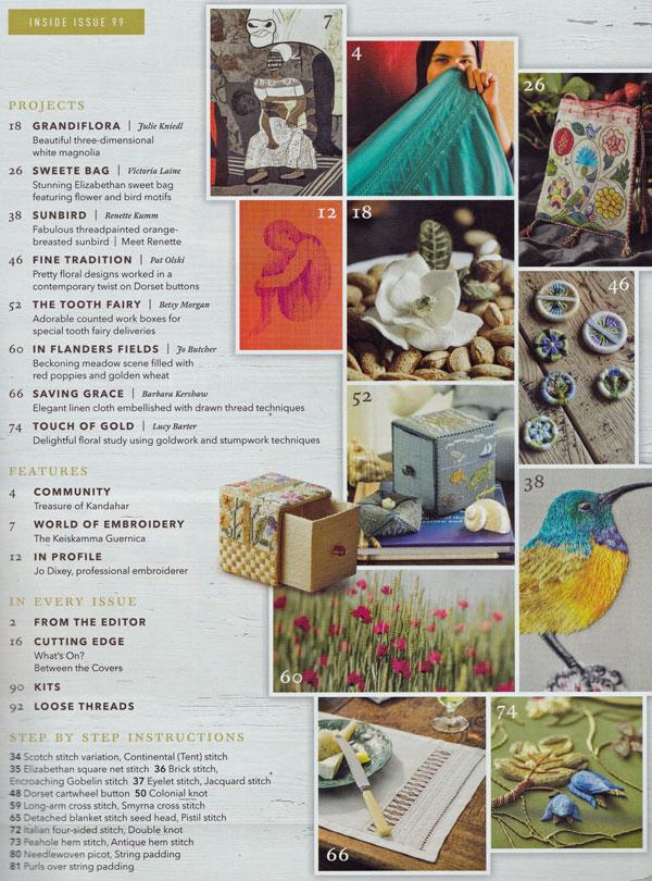 Inspirations MagazineIn this issue, we introduce Deruta Sfilato – unique counted-thread embroidery from Italy, a beautiful twist to shaded blackwork and a fun project featuring three-dimensional bead embroidery. Also find delightful projects featuring crewel and wool embroidery, plus superb stumpwork and threadpainting designs. Featured Projects 'Inspirations Issue 97' features the following projects: Gillian by Maria del Valle Olivera The use of colour with blackwork patterns combined with elegant surface embroidery is perfect for this fabulous hare design Cherry Delight by Jane Nicholas Superb stumpwork roundel with goldword and beading Marguerite by Irina Rudneva Fantastic three-dimensional, beaded white daisy with a sparkling crystal centre La Fauvette by Catherine Laurençon Gorgeous threadpainting of a European warbler amongst reeds and grasses Stitches from the Heart by Maria Elide Melani Learn a delightful Italian embroidery technique with this simple sachet Sunflowers and Daisies by Helen Eriksson A cosy woollen blanket adorned with a circlet and bouquet of sun-loving flowers Autumn Leaves by Monique Johnston A harvest of acorns, blackberries, rose hips and maple leaves embellish this doorstop Aurora by Christine Burton Timeless crewel designs on a handy, zipped pouch