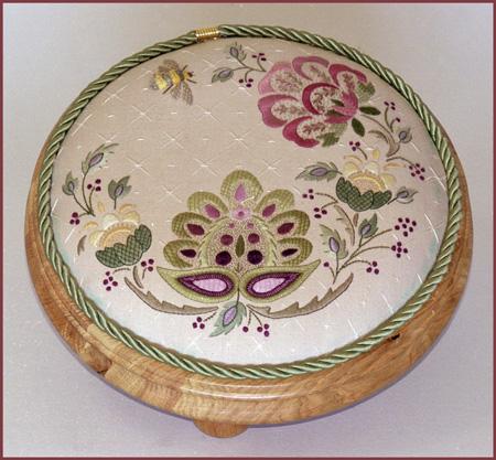 This round Jacobean footstool design measures 25cm diameter (9.84") and is printed on seedcloth.