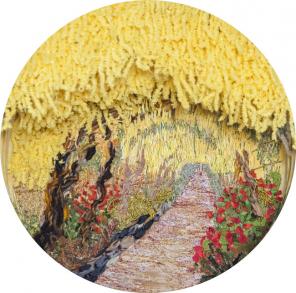 Overwhelmed by the famous Laburnum Arch at Bodnant in Wales. Catherine set about the task of emulating this natural botanical masterpiece by embroidering the cascades of laburnum flowers in layers which are set into the frame in separate circular mounts.