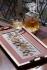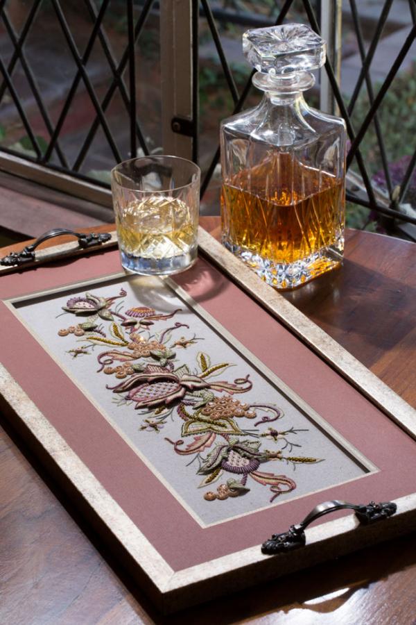 Measuring 365 x 115 mm, this large project has been mounted for use as a drinks tray and is worked on ‘natural’ coloured cotton/linen with stranded cotton, Miyuki beads and Swarovski flat back crystals.