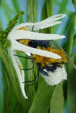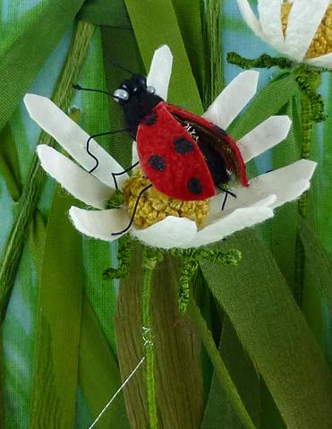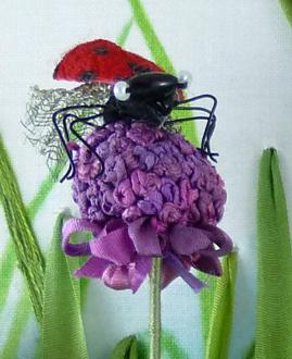 Catherine is constantly fascinated by the bustling of insects going about their daily activities. She has recreated a large scale scene of a small section of grass with bees, ladybirds and a spider worked in three dimensional embroidery. Join her for this fun class and you will create stumpwork bees, sculptured ladybirds and beaded spider amongst fused silk organza leaves, with ribbon embroidered and thread painted grasses, three dimensional clover and daisy flowers set against one of her signature print backgrounds. The design size is 21cm x 28cm