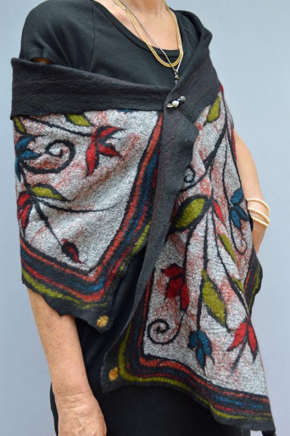 Join Wendy making this lovely large wrap using a traditionally inspired Turkish felting technique using muslin fabric and wool. Creating a large light weight felted wrap which can also be used as a table runner or wall hanging or just make a piece of fabric to incorporate into a garment. You will use traditionally inspired pattern and colours and you will have plenty of colour options. You will learn how to get fine detailed patterns. The wrap will have a black base with your choice of surface fibre decoration and design. You will learn to felt onto a base of wool to create fantastic lightweight felts that are unique and very beautiful .This is a very gentle , quick felting process. It is also a class in creation. Your design- your own creation. We will make one large wrap. Day one will be spent laying out the wrap and beginning the design process, day two will be assembling decorative elements and then wet felting. This is a truly beautiful technique.