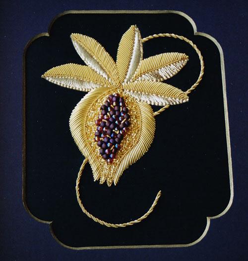 Pomegranate is an intermediate level Goldwork embroidery. It features felt padding, Grecian, laid smooth, rough and bright check purls, kid leather and Mill Hill beads. Design Size: 10cm x 13cm.