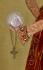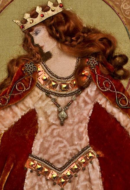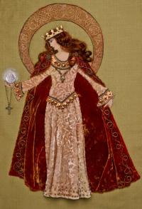 28cm x 28cmThis new lady in Catherine's collection will tempt your needlework skills. Her velvet dress is embossed and her velvet cloak and dress embellished with gold metallic threads, sequins and beads. Her auburn hair is dress with a crown of glittering jewels. Her aura bares a celtic inscription printed on silk organza which you will couch down with metallic threads. Complete this elegant lady by adding a mirrored orb and celtic cross and chain in her right hand.