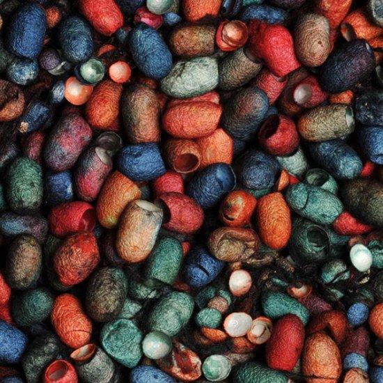 These Stef Francis silk cocoon collections are 25 g in weight and dyed in 9 multicolour mixes. Quantity in pack (average) : 76 cocoons and there may be some cocoon end caps and fibre in these packs also.