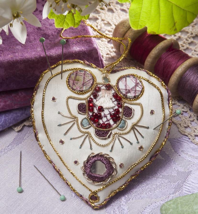 Irene JunkuhnThis elegant Goldwork pincushion compliments the Scissor Chatelaine that was also designed by renowned Designer Irene Junkuhn. This piece features Rajmahal Art Silk, Sadi metallic threads and our enchanting Shisha glass mirrors giving this piece the charm of the orient. We are sure you will find it hard to stop at just one of these gorgeous pincushions. The design size measures: 10cm x 10cm