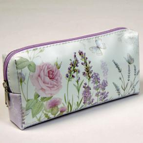 This delicate cosmetic bag measures 8cm x 5cm x 9cm. It is PVC with a nylon lining.