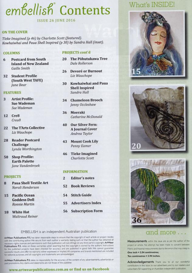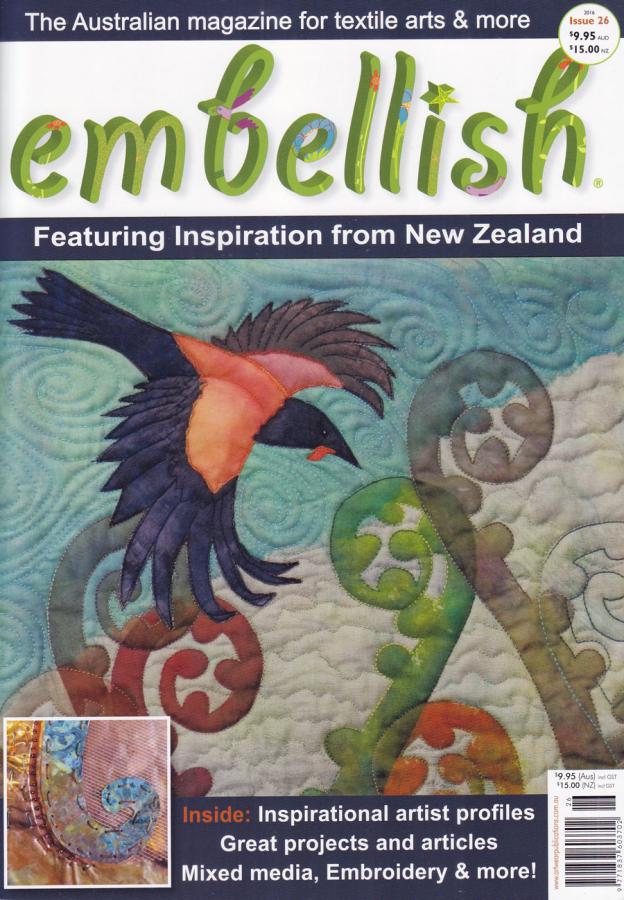 192gEmbellish magazine aims to fuse fashion, fantasy and art into everyday items, gifts and homewares. You will find in each issue a mix of techniques and articles as well as ideas and inspirational stories. Expect to see a range of projects including dye processes; fabric manipulation; knit and/or crochet embellished finishes; couture techniques; hand embellishing; machine embellishing; prints; custom designs; repurposed textiles and projects related to textile applications that incorporate fabric, yarn, felt and/or fibre.