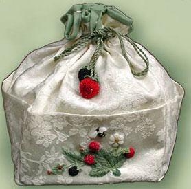 The clear instructions will help you with the easy bag construction and the final embellishment of berry tassels. The project is worked on cream damask.
