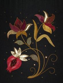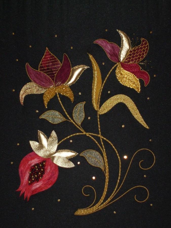 Another Jacobean inspired design featuring English Goldwork threads and Gumnuts hand dyed silk threads. This piece uses an assortment of items including Grecian, #1 Twist, Smooth Purl, Rough Purl, Bright Check Purl, Pearl Purl, Metallic Organza, Kid Leather, coral beads, garnet beads and paillettes. Design size 19cm x 24cm.