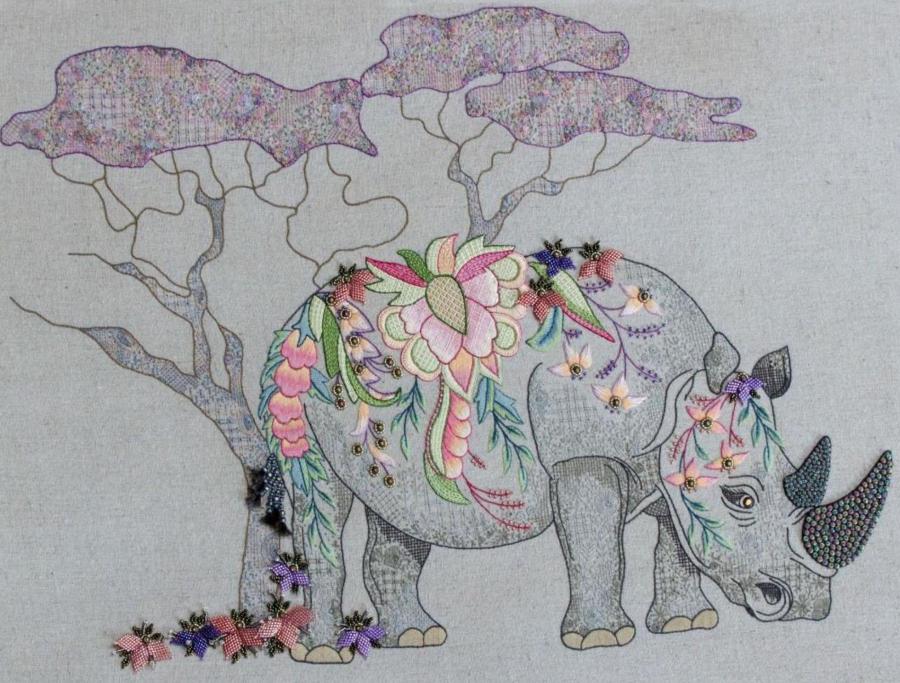 This huge and interesting animal, a throwback to the time of the dinosaurs, is critically endangered because of poaching. Whilst normally seen with tick birds perching on their backs, Roger has been prettied up with Jacobean Flowers instead. This project measures 430 x 315 mm and you should not be frightened by the plethora of stitches that create the texture of the animals hide and the tree, trunk and leaf umbrella. It’s easy once you start.