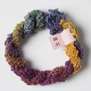 Stef Francis Silk Boucle is a fancy yarn and creates a creative appearance even when straight stitched. It is hand dyed, beautifully soft and each skein comes in an 8 metre length.