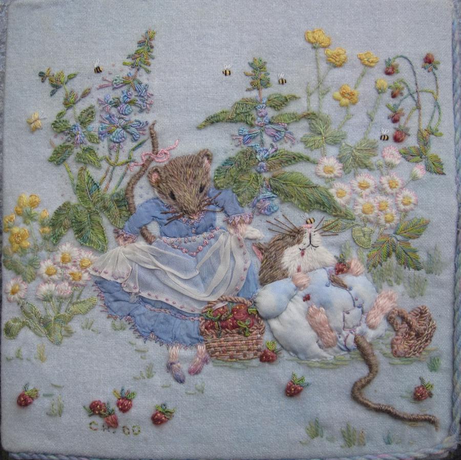 22cm sqaure (8 3/4")Capture the delights of Molly and Roly as they gather wild strawberries amongst buttercups, daisies and wild thyme. Catherine has created this inspiring pair of mice in Kacoonda's exciting colour palette of embroidery silk threads and wool.