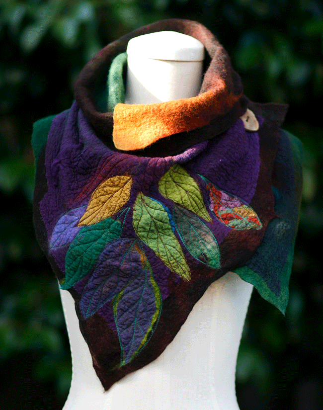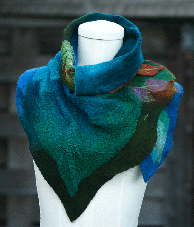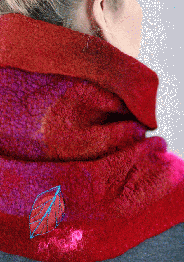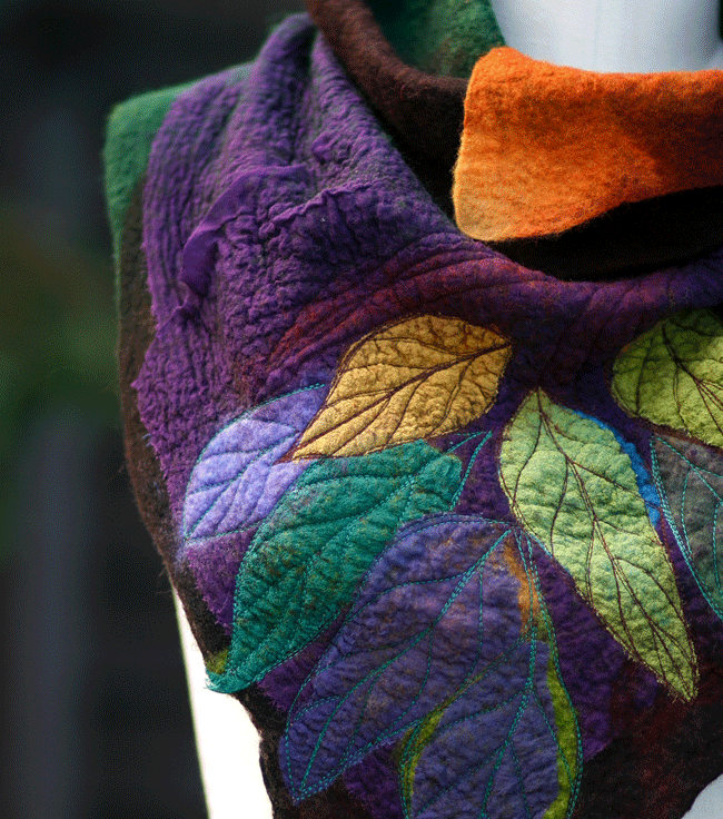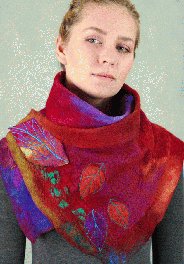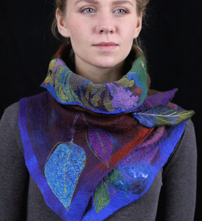 Painting nature with prefelts, lamination, machine embroidery accents, and other decorative techniques. You will begin by collecting natural elements, like plants, in particular leaves or petals as our inspirational material. You will work on an idea based on these elements, come up with a sketch and color story to create a big, two way cowl-scarf. Students will learn how to turn an inspired idea into a complete, refined and polished final product with an individual unique design. Each student will create their own wearable art piece, which can be worn in two different ways. During this workshop you will learn the techniques that the use of sanders will bring to your felted design.