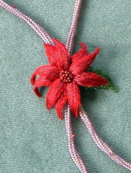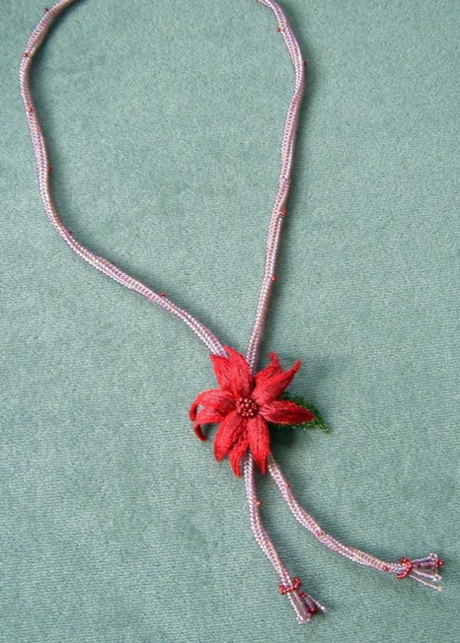 This beautiful necklace was created using a combination of beading and embroidery. The beading is done with Ndebele Beading stitch and the exquisite flower and leaf is embroidered using the Barbaola technique.