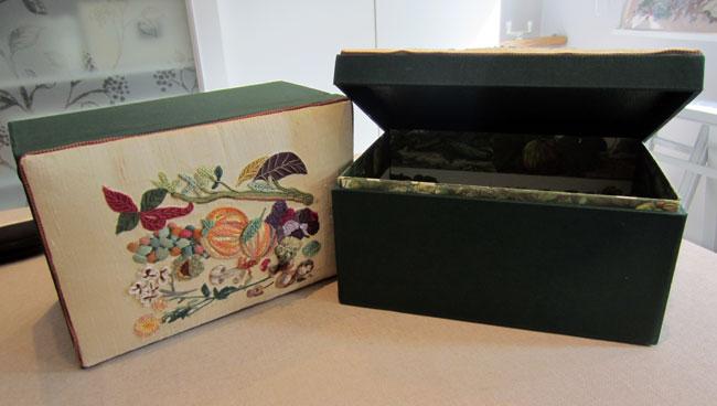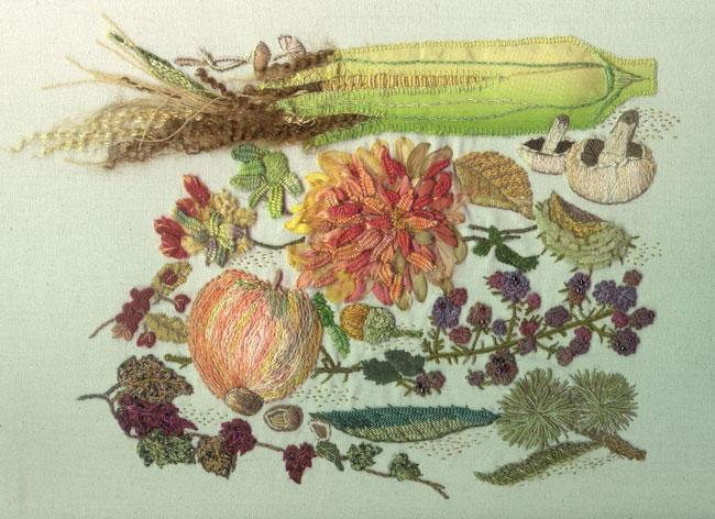 This is a veritable feast of techniques and stitches used to create vegetables, fruit, mushrooms, nuts and flowers. The techniques covered will include padded and beaded stitches, ruched and wired appliqué as well as working with textured threads. The students will be taught crewel embroidery using thread with a twist and composite stitches. Templates for box making will be provided as well as a full demonstration.