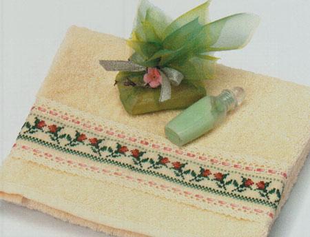 Rose Border by Di Noyce - The rose towel was worked in cross stitch over two threads on 28 count cream Quaker Cloth using two strands of Anchor stranded cotton and attached to a hand towel with cotton lace and matching ribbon. The Stitch count is 24 wide x 18 high for each repeat.