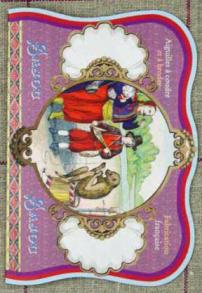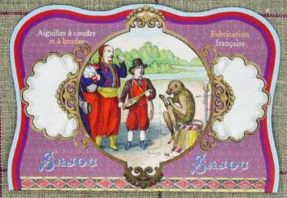 The cover represents a monkey winding wool. The interior is a floral print in mauve and purple tones. The packet measures when closed 14 cm x 9.8 cm and all needles are made in France.