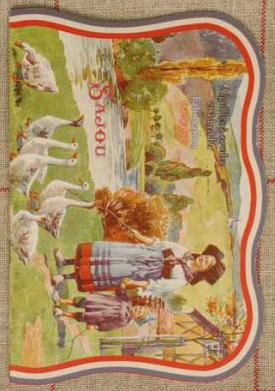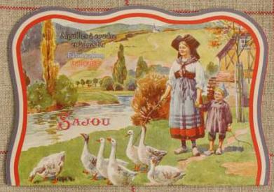 The cover represents an Alsatian woman and a little boy. The interior is a striped print in red, white and blue.