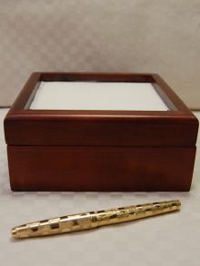 The simple square box has a mahogany finish. The size of the box is 6" x 6" x 2 3/4" (15.24cm x 15.24cm x 6.98cm). It does not come with glass or a lining. The embroidery is mounted from the inside as is a picture frame.
