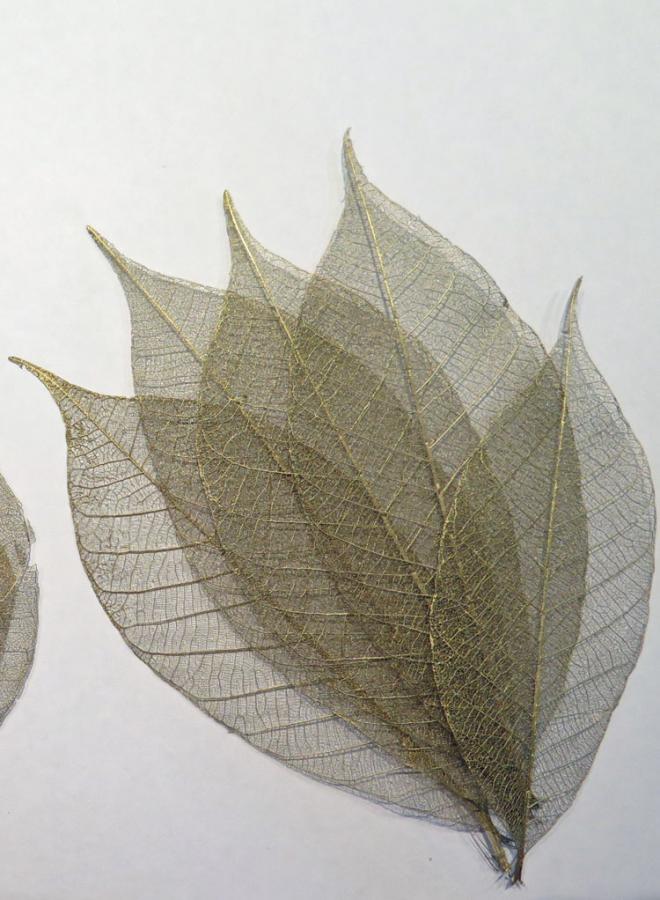 The pack contains 10 leaves, 5 each of two types of leaves (rubber and bodhi tree). Skeleton leaves are real leaves that are dried and treated so that the epidermis is removed, leaving behind just the “skeleton” of veins, then dyed. Whilst delicate in appearance, skeleton leaves are surprisingly sturdy and make wonderful additions to felting, fibre fusion, mixed media, scrapbooking, papermaking, art journaling and gift wrapping,