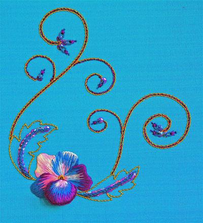 A warm spring morning, bright blue sky, pansies nod in the breeze. In our embroidery we will combine the freshness of new growth and dimensionality with the formal beauty of goldwork. The warmth of the sun reflects in the gold metallics as you shade your pansy created in soft twist silks. The outward spiral brings the flowers and leaves to three-dimensional life.